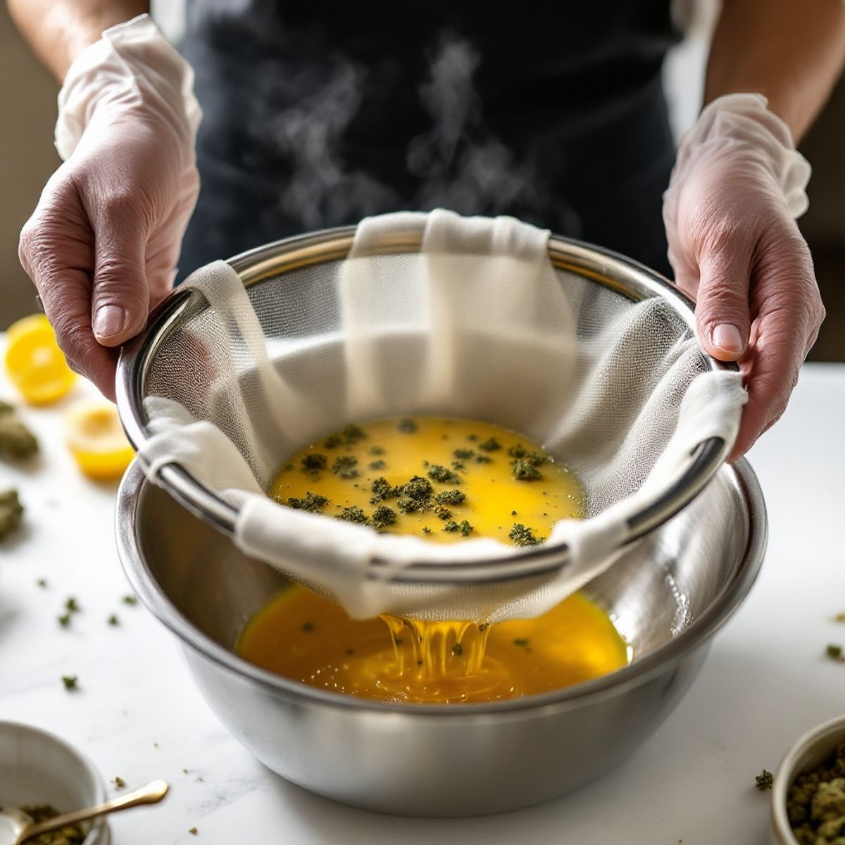 - Drücke die Pflanzenreste vorsichtig aus, um die verbleibende Butter zu extrahieren.